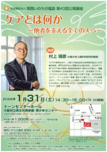 公益財団法人関西カウンセリングセンターでは、社会福祉法人関西いのちの電話主催の第43回公開講座「ケアとは何か~他者を支える全ての人は~」(講師:村上 靖彦)を後援しております。